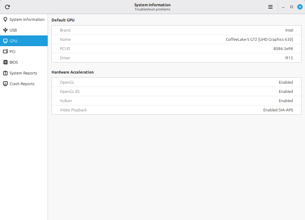 The “GPU” page shows information about your default graphics card and its support for hardware acceleration.